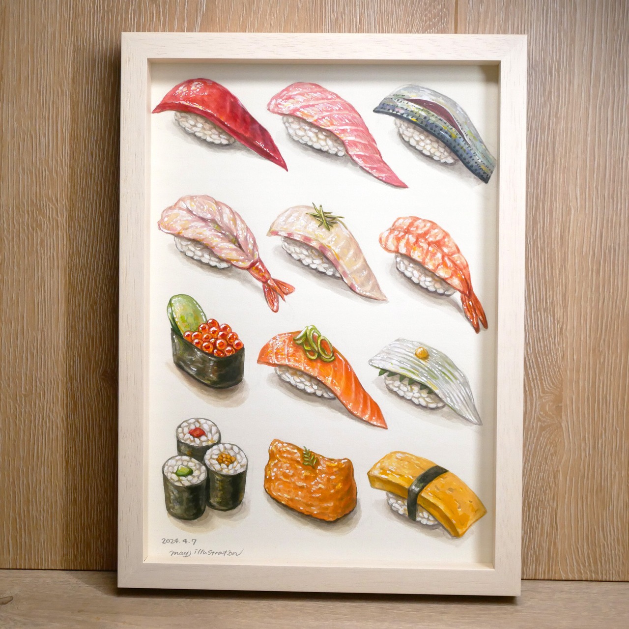I used acrylic gouache to paint 12 delicious looking pieces of sushi arranged like a collection. The original illustration is a slightly larger B4 size.